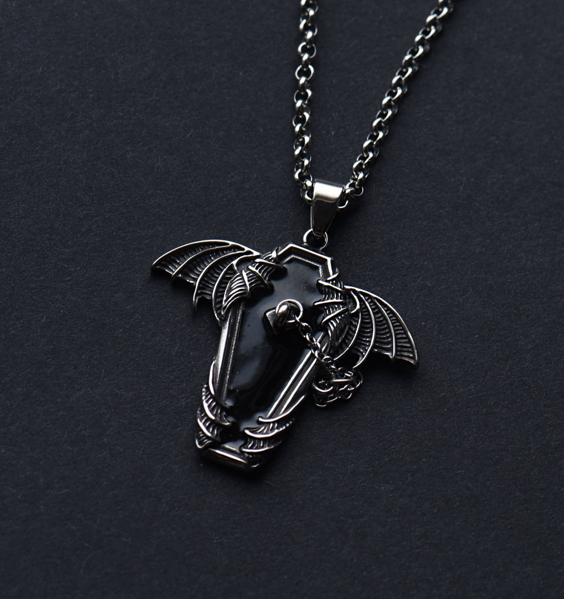 Stainless steel bat wings coffin necklace with a 18 inch chain